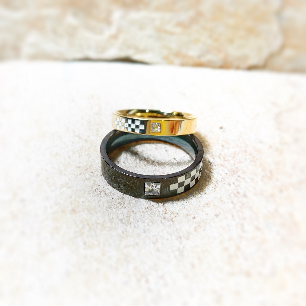 スクエア型のジルコニアが埋め込まれた細身のリングは、片方のサイドに白の市松模様がアクセントになっています。