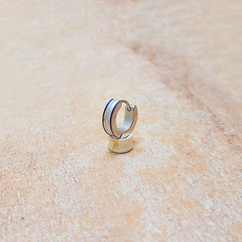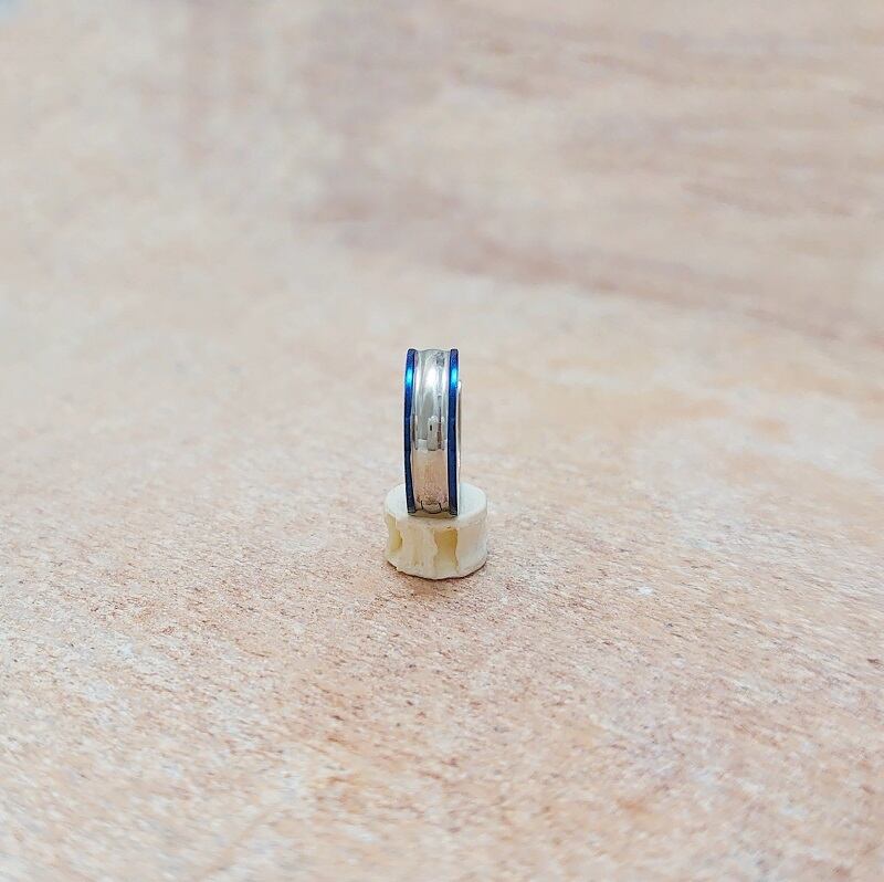 鏡面仕上げの甲丸デザインの両サイドに、PVDコーティングブルーカラーで縁取りをしたシンプルなピアスです。