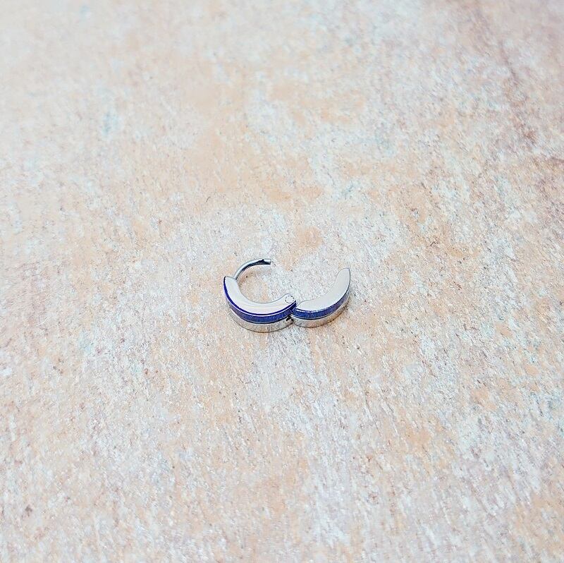 鏡面仕上げのシルバーカラーとPVDコーティングブルーのバイカラーのミニピアスです。