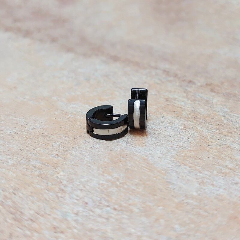 ヘアライン仕上げのシルバーカラーを中央に配置して、PVDコーティングのブラックで挟み込んだ、バイカラーのミニピアスです。