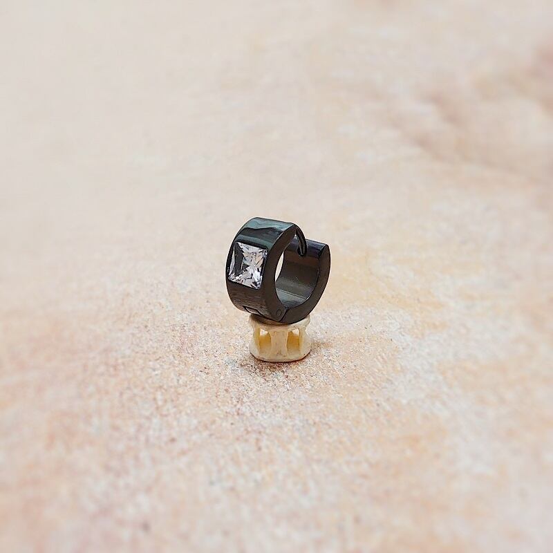 スクエア型のホワイトジルコニアが埋め込まれたPVDコーティングのブラックカラーのピアスは、ラグジュアリーで存在感のあるデザインで、デイリーユーズからパーティーシーンまで幅広くお使いいただけます。