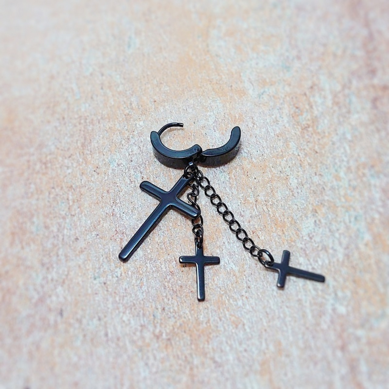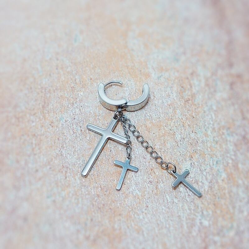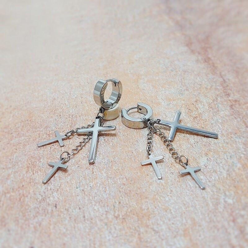 シンプルなプレーンピアスの下に 大小3つのクロスが揺れる、存在感のあるステンレスピアスです。