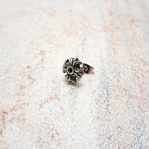 ユリの紋章を組み合わせたようにも見えるクロスのピアスは、センターにブラックジルコニアが入った存在感のあるアイテムです。
