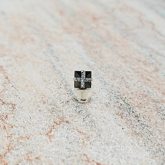 スクエア型のブラックジルコニアにクロスさせたホワイトジルコニアが埋め込まれたスタッドピアスです。