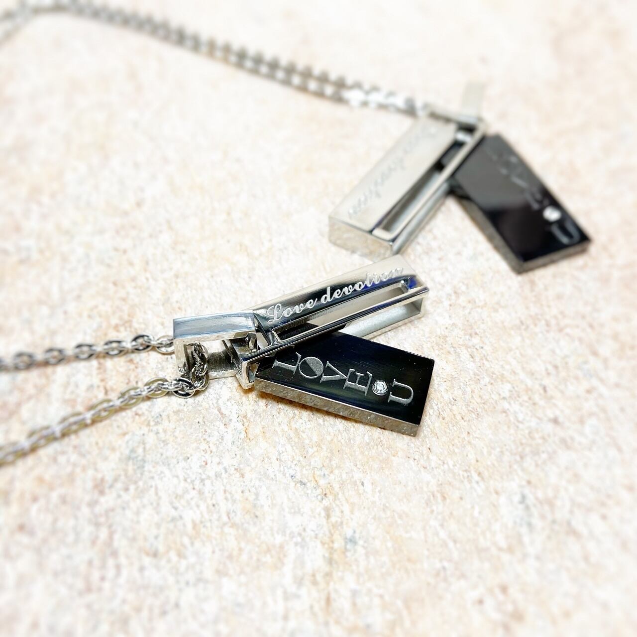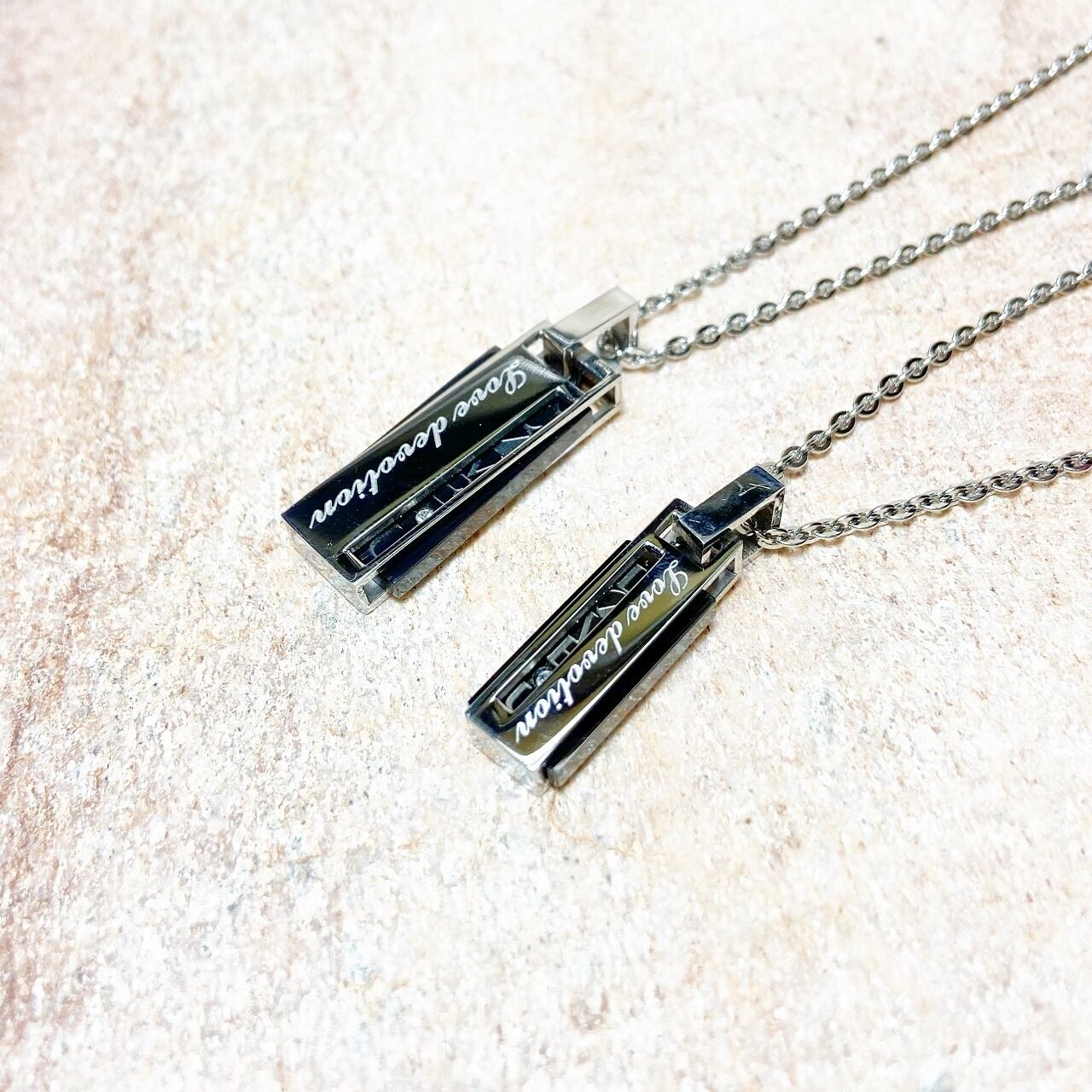 ボックス型のプレートにPVDコーティングのプレート状チャームが左右に揺れる、個性的なデザインのペアネックレスです。