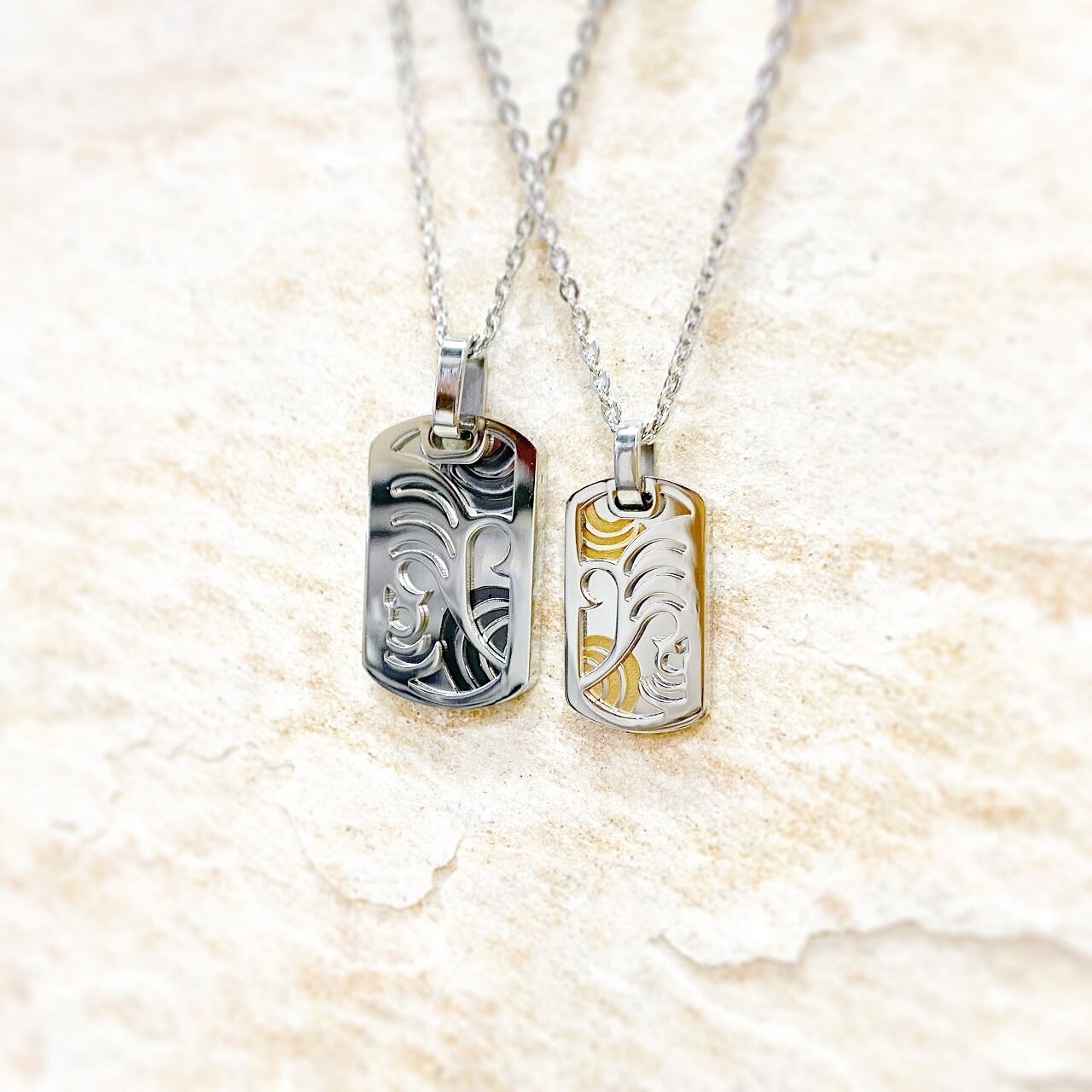 下のドッグタグにはPVDコーティングで和柄のような模様が描かれ、繊細かつ個性的なデザインとなっています。